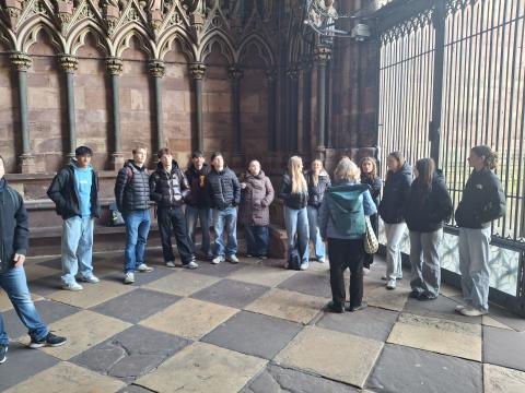 Der faszinierende Bau des Freiburger Münsters, mit all seinen Besonderheiten "gibt einen Vorgeschmack auf das Himmelreich", so der 28-jährige Dominikanerbruder Frater Dominicus Maria aus dem Stadtkloster von St. Martin am Freiburger Rathausplatz. Auch die Kunsthistorikerin Sabine Ullrich konnte auf zahlreiche interessante, sowohl bauliche wie geschichtliche, Details am und im Münster hinweisen. Der Besuch des Augustinermuseum bot einen Einblick in die sakrale Kunst und die Theologie des Mittelalters und der frühen Neuzeit. Die Schüler tauchten beim Betreten des Münsters,  welches, damals wie heute, das Zentrum der mittelalterlichen Stadt Freiburg darstellt, sowie beim Besuch desAugustiner Museums und des Stadtklosters bei St. Martin am Rathausplatz, in eine für Sie immer fremder werdende Welt ein. Biblische Darstellungen in Kunstwerken und christliche Lebensweisen im persönlichen Gespräch mit Frater Dominicus Maria eröffneten den Schülern und Schülerinnen ganz neue Perspektiven auf die Wirklichkeit und das menschliche Leben mit all seinen Facetten. So fügte sich die Exkursion und deren Inhalte perfekt in die ersten Themen der Kursstufe im Fach Katholische Religion ein. Wir wünschen den Schülern und Schülerinnen, dass sie das Erlebte lange in Erinnerung behalten werden und so manche Inhalte und Ausführungen der Vortragenden sie zum Nachdenken anregen mögen.