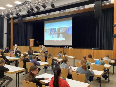 Am 12.12.25 nahmen alle 6.Klassen während jeweils 3 Schulstunden am Workshop „Klicksalat“ mit dem Medientrainer Jörg Kabierske teil. Zunächst brachten die Schülerinnen und Schüler in Partnerarbeit die zehn Gebote der digitalen Ethik (z.B. „Respektiere die Würde anderer Menschen und bedenke, dass auch online Regeln gelten.“) in eine für sie schlüssige Reihenfolge. Im Anschluss ging Herr Kabierske auf Fragen zu diesen Geboten ein und beantwortete diese mit Hilfe eindrücklicher Videos und Berichten aus eigener Erfahrung. Im Anschluss daran erhielten die Gruppen Einblicke in die Themen Jugendschutz, Rechtslage für Social-Media-Nutzende sowie Vor- und Nachteile der Nutzung von KI.
