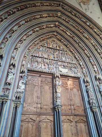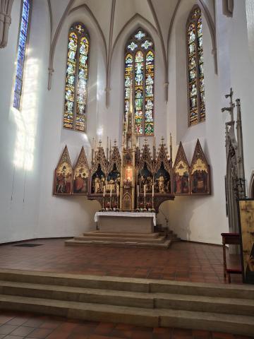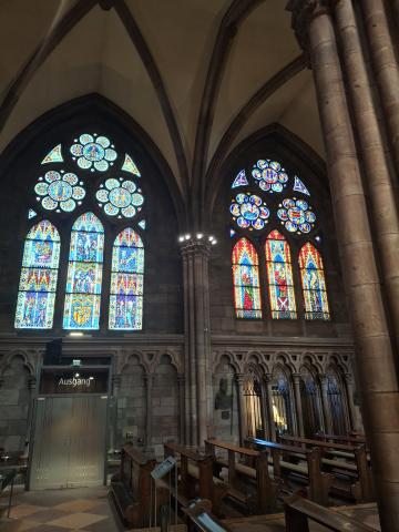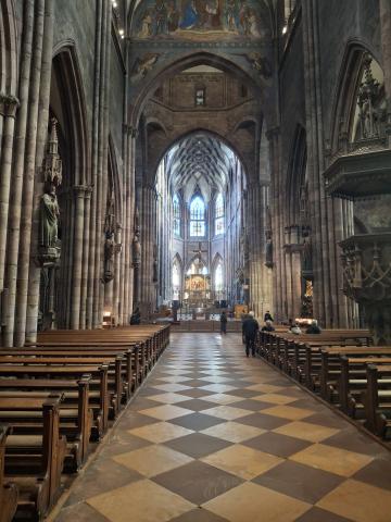 Der faszinierende Bau des Freiburger Münsters, mit all seinen Besonderheiten "gibt einen Vorgeschmack auf das Himmelreich", so der 28-jährige Dominikanerbruder Frater Dominicus Maria aus dem Stadtkloster von St. Martin am Freiburger Rathausplatz. Auch die Kunsthistorikerin Sabine Ullrich konnte auf zahlreiche interessante, sowohl bauliche wie geschichtliche, Details am und im Münster hinweisen. Der Besuch des Augustinermuseum bot einen Einblick in die sakrale Kunst und die Theologie des Mittelalters und der frühen Neuzeit. Die Schüler tauchten beim Betreten des Münsters, welches, damals wie heute, das Zentrum der mittelalterlichen Stadt Freiburg darstellt, sowie beim Besuch desAugustiner Museums und des Stadtklosters bei St. Martin am Rathausplatz, in eine für Sie immer fremder werdende Welt ein. Biblische Darstellungen in Kunstwerken und christliche Lebensweisen im persönlichen Gespräch mit Frater Dominicus Maria eröffneten den Schülern und Schülerinnen ganz neue Perspektiven auf die Wirklichkeit und das menschliche Leben mit all seinen Facetten. So fügte sich die Exkursion und deren Inhalte perfekt in die ersten Themen der Kursstufe im Fach Katholische Religion ein. Wir wünschen den Schülern und Schülerinnen, dass sie das Erlebte lange in Erinnerung behalten werden und so manche Inhalte und Ausführungen der Vortragenden sie zum Nachdenken anregen mögen.