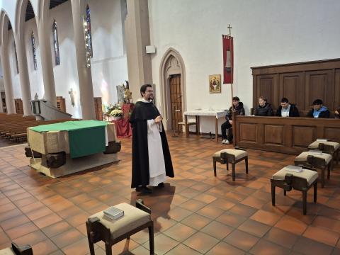 Der faszinierende Bau des Freiburger Münsters, mit all seinen Besonderheiten "gibt einen Vorgeschmack auf das Himmelreich", so der 28-jährige Dominikanerbruder Frater Dominicus Maria aus dem Stadtkloster von St. Martin am Freiburger Rathausplatz. Auch die Kunsthistorikerin Sabine Ullrich konnte auf zahlreiche interessante, sowohl bauliche wie geschichtliche, Details am und im Münster hinweisen. Der Besuch des Augustinermuseum bot einen Einblick in die sakrale Kunst und die Theologie des Mittelalters und der frühen Neuzeit. Die Schüler tauchten beim Betreten des Münsters,  welches, damals wie heute, das Zentrum der mittelalterlichen Stadt Freiburg darstellt, sowie beim Besuch desAugustiner Museums und des Stadtklosters bei St. Martin am Rathausplatz, in eine für Sie immer fremder werdende Welt ein. Biblische Darstellungen in Kunstwerken und christliche Lebensweisen im persönlichen Gespräch mit Frater Dominicus Maria eröffneten den Schülern und Schülerinnen ganz neue Perspektiven auf die Wirklichkeit und das menschliche Leben mit all seinen Facetten. So fügte sich die Exkursion und deren Inhalte perfekt in die ersten Themen der Kursstufe im Fach Katholische Religion ein. Wir wünschen den Schülern und Schülerinnen, dass sie das Erlebte lange in Erinnerung behalten werden und so manche Inhalte und Ausführungen der Vortragenden sie zum Nachdenken anregen mögen.