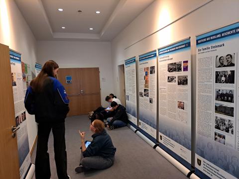 Die Ausstellung war übersichtlich in Tafeln gegliedert, die mit historischen Fotos, Karten, Dokumenten und Zitaten gestaltet waren. Besonders eindrucksvoll fanden wir die persönlichen Geschichten einzelner Familien, die den historischen Fakten ein menschliches Gesicht gaben. Ergänzt wurde alles durch Zeittafeln und historischen Karten, die halfen, die Geschehnisse zeitlich und geografisch einzuordnen. Besonders schockierend fanden wir, wie grausam und systematisch die Deportationen durchgeführt wurden. Es war erschütternd zu erfahren, dass so viele unschuldige Menschen nur wegen ihrer Herkunft verfolgt wurden. Gleichzeitig beeindruckte uns, wie stark und widerstandsfähig viele Russlanddeutsche geblieben sind, trotz Verlust, Leid und Entwurzelung. Erst Mitte der 1950er-Jahre begann eine schrittweise, jedoch unvollständige Rehabilitierung. Seit den 1970er-Jahren durften wieder größere Gruppen nach Deutschland ausreisen. Vor allem seit den Reformen Gorbatschows (Perestroika und Glasnost) und dem Zerfall der Sowjetunion kamen bis heute rund 2,5 Millionen Menschen als sogenannte „(Spät-)Aussiedler“ nach Deutschland.