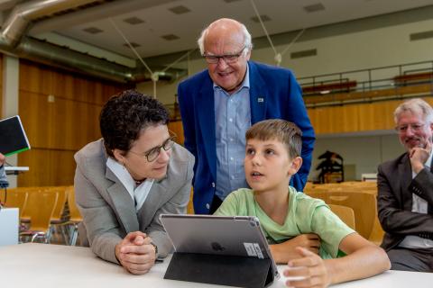 „Digitale Technologien sind heute fester Bestandteil der meisten Berufe. Wir müssen unsere Kinder fit für die Zukunft machen - also brauchen die Schulen auch die entsprechende Ausstattung“, begründete er im Rahmen der Feststunde in der Aula des Gymnasiums sein Engagement. Fast alle der über 100 Fünftklässler waren gekommen, um der Übergabe der iPads beizuwohnen.