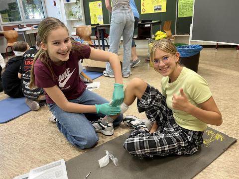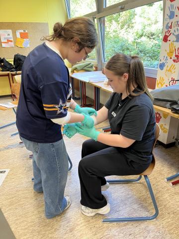 Neun Schülerinnen der 8. und 9. Klassen beschäftigten sich unter der Leitung von Frau Aidam und Frau Beiser intensiv mit Erster Hilfe. Der Kurs wurde bei den Projekttagen des letzten Schuljahres begonnen und im neuen Schuljahr nun vervollständigt. Wichtige Maßnahmen wie die Wundversorgung mit Verbänden und Dreiecktüchern und Druckverbände anlegen wurde geübt, die Herz-Lungen-Wiederbelebung (HLW) mit und ohne Defibrillator durchgespielt, verunglückten Kraftradfahrern der Helm abgenommen und viele Themen wie beispielsweise Herzinfarkt, Schlaganfall, Krampfanfälle, Zeckenentfernung... besprochen.