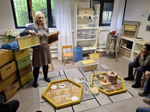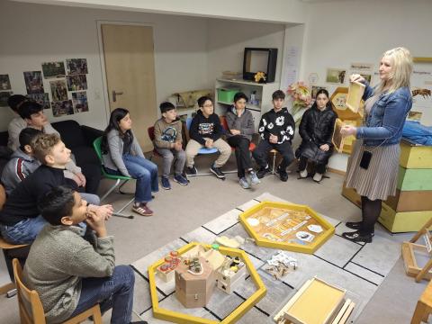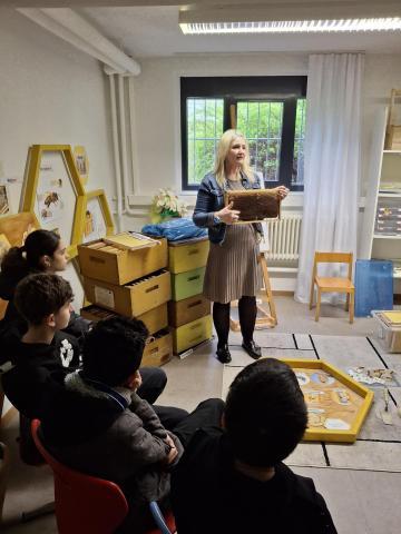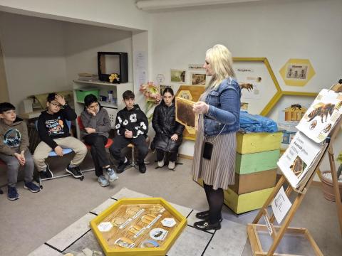 "Summ, summ, summ, Bienchen summ herum", so konnten unsere Schülerinnen und Schüler der VKL im eigens gedrehten Film der Gutenbergschule es hören, als die dortige Bienen-AG ihr Projekt vorstellten. Seit vielen Jahren leitet Katharina Riedel mit viel Herzblut die BienenAG und schafft es dadurch immer wieder, junge Menschen für das Thema Bienen zu begeistern. So ist es Ihr am Donnerstag, den 26.03.26 auch gelungen, uns mit Ihren Ausführungen und den zahllosen Materialien im Bienenzimmer in den Bann zu ziehen. Über zwei Zeitstunden lang konnten unsere Schüler durch praktisches Erleben, Experimentieren und sogar Verkosten des Gutenbergschulhonigs Wertvolles über die Welt der Bienen lernen. Leider waren die Temperaturen der letzten Tage zu kühl, als dass Frau Riedel die Bienenstöcke hätte öffnen können. Wir freuen uns daher schon jetzt, vielleicht in den Sommermonaten, die Bienen nochmals besuchen zu dürfen.
