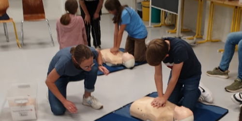 16 Schülerinnen und Schüler der 7. und 8. Klassen beschäftigten sich unter der Leitung von Frau Wolfschlag, Frau Aidam und Frau Beiser zweieinhalb Tage lang mit Erster Hilfe. Es wurde die Wundversorgung mit Verbänden und Dreiecktüchern geübt, Druckverbände angelegt, die Herz-Lungen-Wiederbelebung (HLW) mit und ohne Defibrillator durchgespielt,…