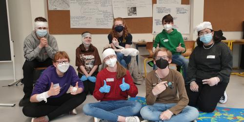 Bilder des Ausbildungskurses für Schulsanitäter/innen, den alle acht Teilnehmenden erfolgreich absolviert haben. Zweieinhalb Tage haben sie fleißig in Theorie und Praxis Erste Hilfe-Maßnahmen geübt.